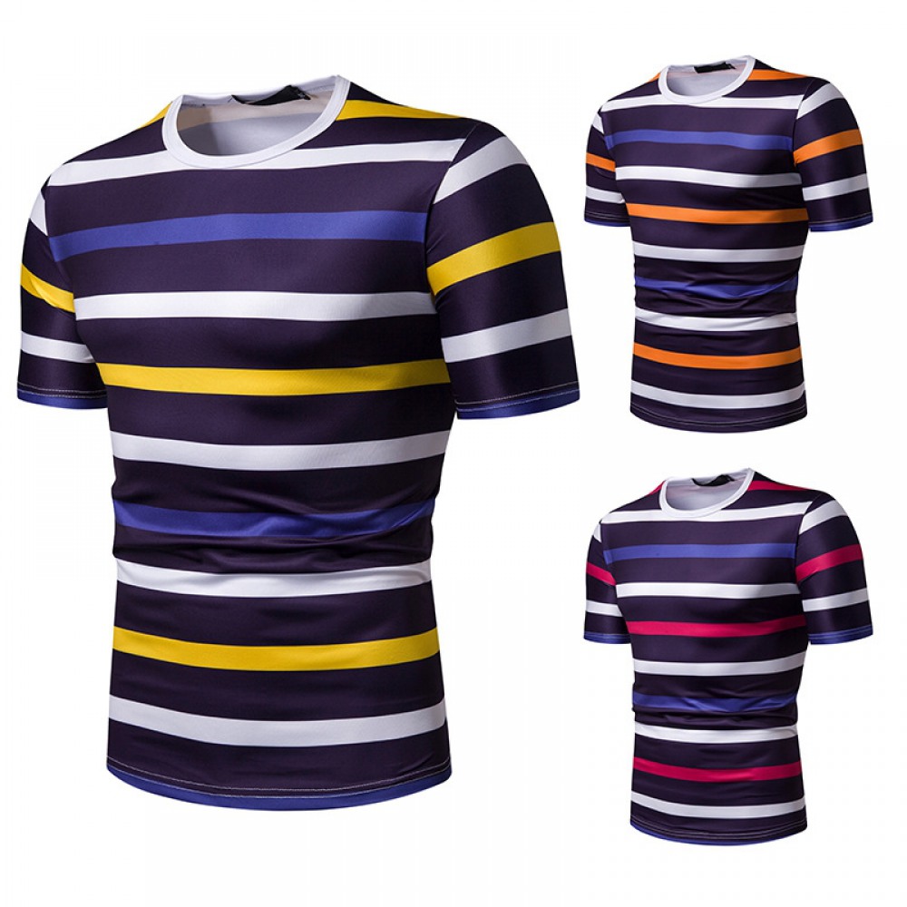 New Summer Men's Short-Sleeved T-Shirt Contrast Striped Slim Casual T-Shirt